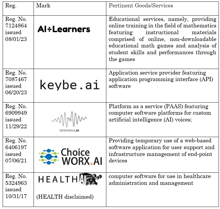 出願人は、「AI」の語が、単にAI(人工知能)を組み込んだ、またはAIに関連するソフトウェアの記述表示には該当しないとの主張を裏付けるため、「AI」の文字部分をディスクレームせずに主登録簿に登録された第三者の「AI」の語を含む商標を提出した。ひとつのまとまった商標が、一つの明確な出所表示としての印象を生じ、登録が認められない構成要素を含まなければ、当該商標構成中の登録不能部分における権利不要求の条件は免責される。以下に示す第三者の商標登録は、表面上、「AI」の語と識別性のある文字又は図形との組み合わせであるため、これらの商標構成中に「AI」の語が含まれている事実は、「AI」の語が自他識別力を有することの証明にはならない: