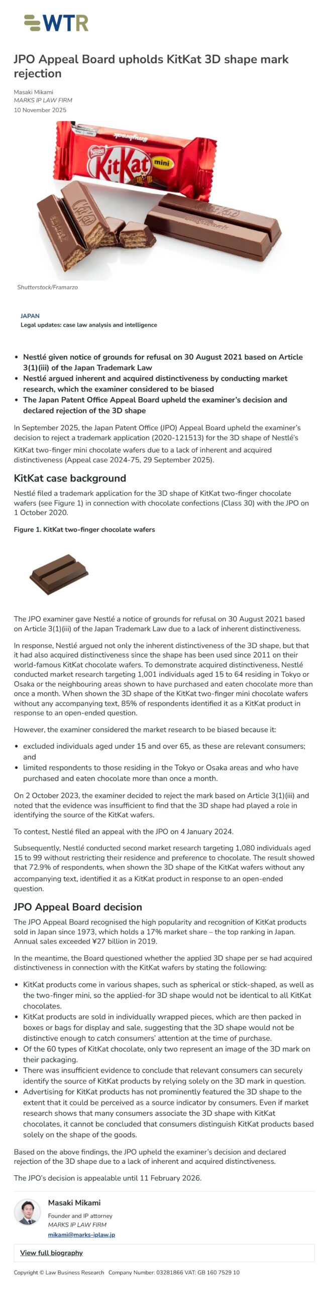 ネスレ社のチョコレート菓子「KitKat」の立体形状の使用による特別顕著性が争われた拒絶査定不服審判事件に関するマークス代表・三上弁理士の記事が、世界最大の海外商標メディア「World Trademark Review (WTR)」に掲載されました。