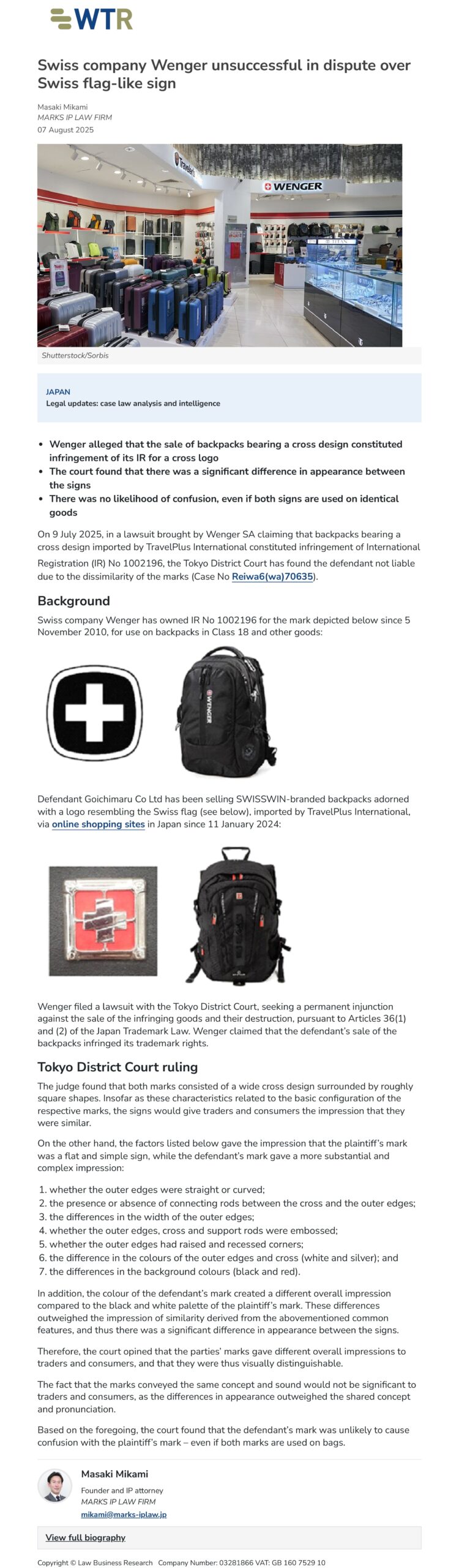 スイス国旗を想起させるロゴ図形が、Wenger社の赤十字図形商標と類似するかが争われた、東京地裁の商標権侵害訴訟事件に関するマークス代表・三上弁理士の記事が、世界最大の海外商標メディア「World Trademark Review (WTR)」に掲載されました。
